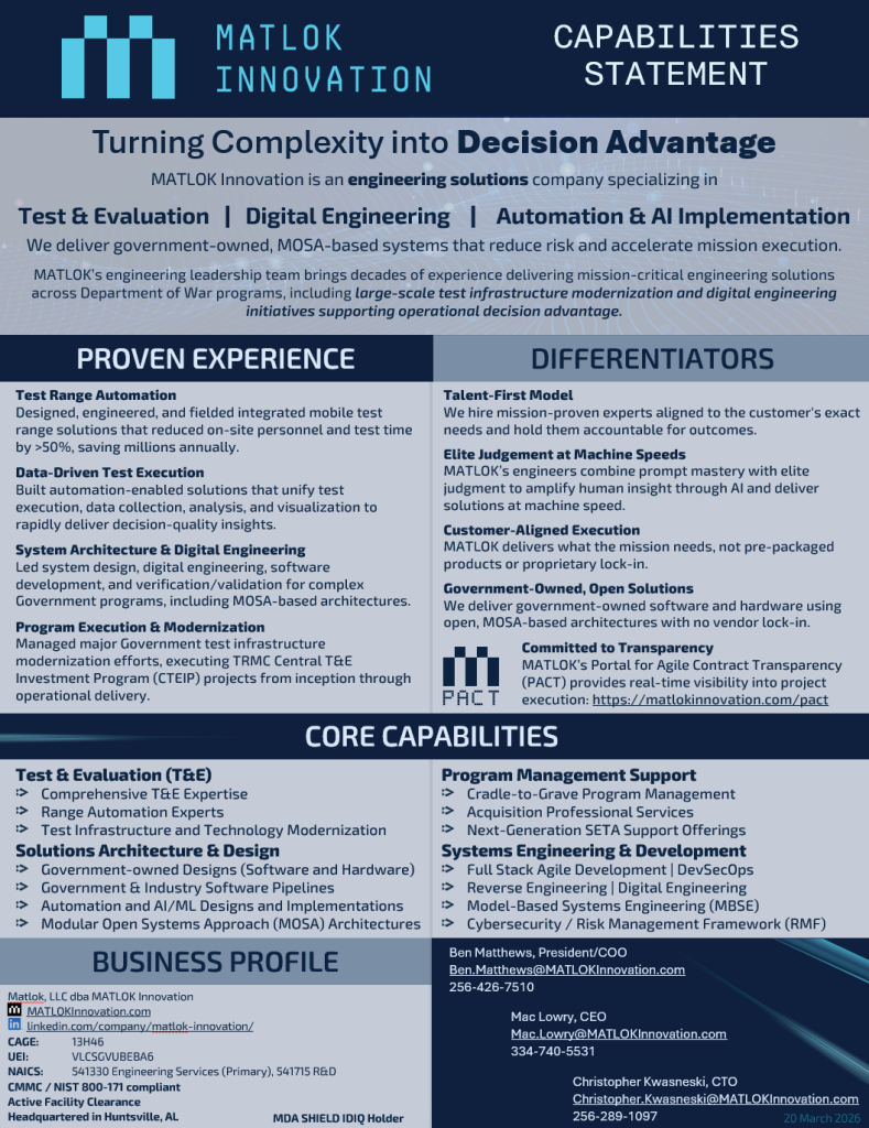 Mission capabilities first. MATLOK ensures your team gets capabilities that work. We are experts at modernization, integration, automation, and reverse-and-re-engineering systems to make them what the stakeholders need.
